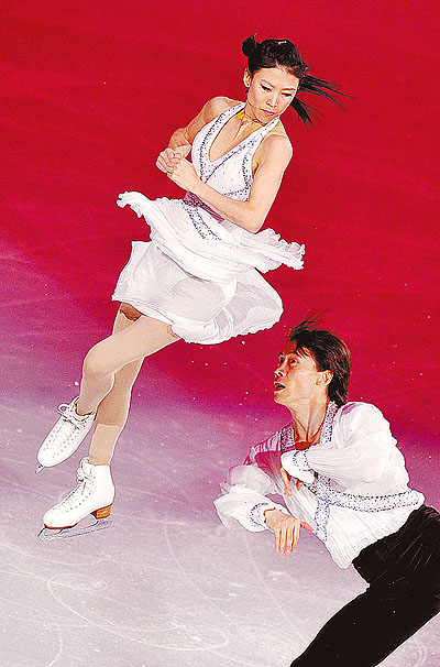 当地时间2月27日,中国选手庞清/佟健在温哥华冬奥会举行花样滑冰表演中。新华社记者 陈晓伟摄