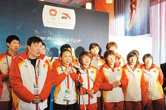 当地时间2月27日,中国短道速滑队在温哥华举行的庆功会上向全国人民致以元宵节的问候。新华社记者 马丹摄