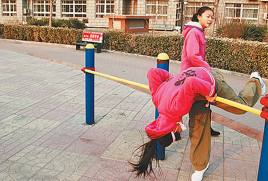 李芳圆和同伴儿在家附近的小区单杠上翻跟头。