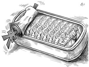 重庆忠县一小学,一间只能装四五十个学生的教室,因择校生越收越多一下装了近百人,学生出入教室都得排队。(《重庆晚报》3月2日)漫画:徐简