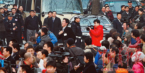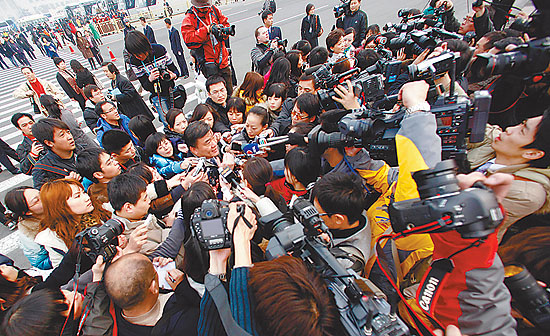 3月3日下午,全国政协十一届三次会议在北京人民大会堂开幕。被记者团团围住的运动员刘翔跑步冲出人群,奔向会场。本报记者 李建泉摄