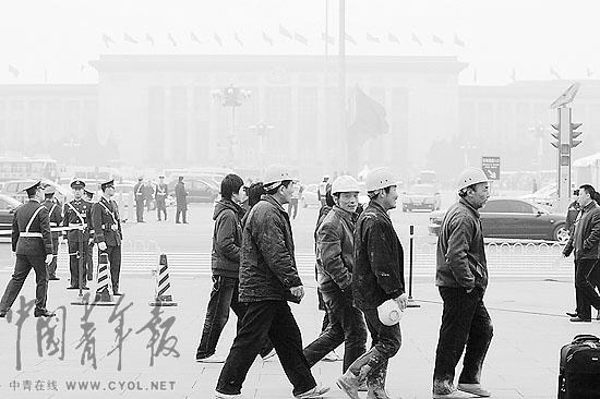 3月3日下午,一群在附近工地上班的农民工经过天安门广场。当日,全国政协十一届三次会议在人民大会堂开幕。2010年,“新生代农民工”提法首次纳入中央一号文件,在今年的全国两会上,农民工问题将成为讨论的焦点。 本报记者 陈剑摄
