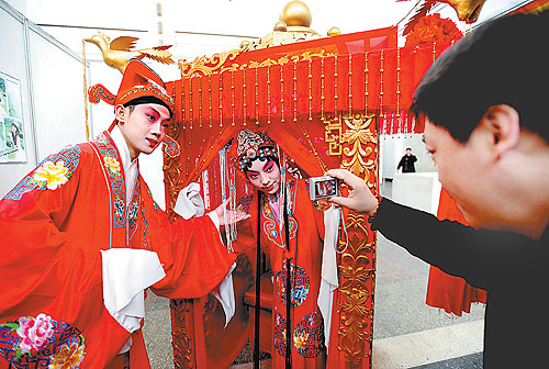 3月5日,沈阳市民在国际婚博会婚庆文化节活动现场一家影楼的展位拍照。