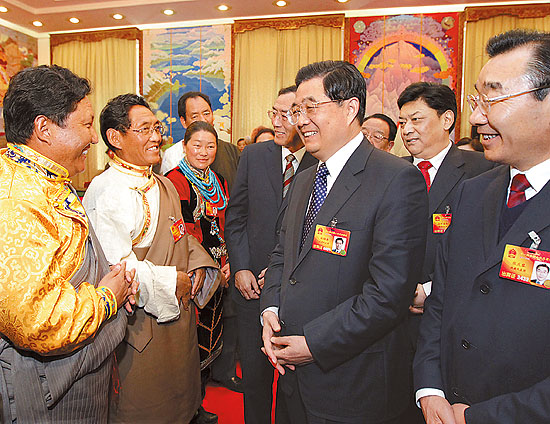 3月6日上午,出席十一届全国人大三次会议的西藏代表团在人民大会堂西藏厅举行全体会议,中共中央总书记、国家主席、中央军委主席胡锦涛来到这里,同来自雪域高原的代表们一道审议政府工作报告,共谋如何把中央第五次西藏工作座谈会精神落到实处、推进西藏跨越式发展和长治久安大计。