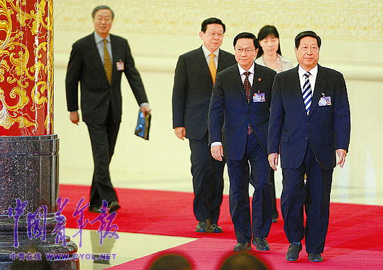 3月6日,十一届全国人大三次会议在人民大会堂三楼金色大厅举行记者会,国家发展和改革委员会主任张平、财政部部长谢旭人、商务部部长陈德铭、中国人民银行行长周小川(从右往左),就加强和改善宏观调控问题答记者问。 本报记者 陈剑摄