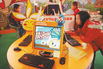 2009年12月6日,第七届中国国际网络博览会在北京展览会举行。几位小朋友在“青少年绿色网络”展台体验“摩尔庄园”游戏。