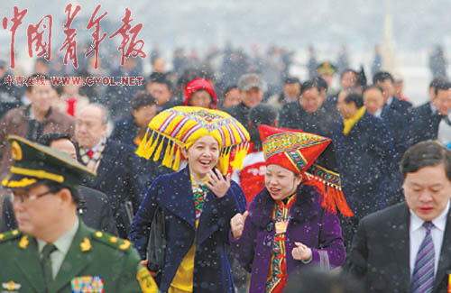 3月8日,天安门广场,两位来自广西壮族自治区的女代表穿过漫天飞雪步入会场。当日,十一届全国人大三次会议在人民大会堂举行第二次全体会议。北京的一场降雪,给参会的女同胞们献上一个特殊的“三八”国际劳动妇女节礼物。