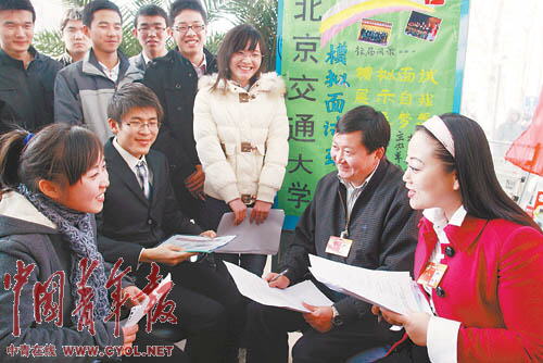 3月9日,在京参加全国两会的政协委员严琦(右一)、张洪利用大会休息时间来到北京交通大学调研,并在该校举办的现场模拟招聘会上客串招聘官,为大学生进行面试点评,与大家一起分享成才经验和创业经历。