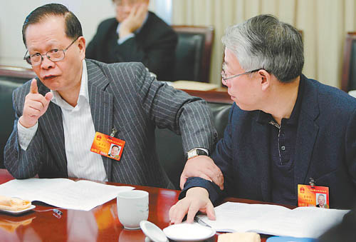 3月11日,上海代表团龚学平代表(左)在秦绍德代表(右)发言时要求插话,阐述自己的观点。