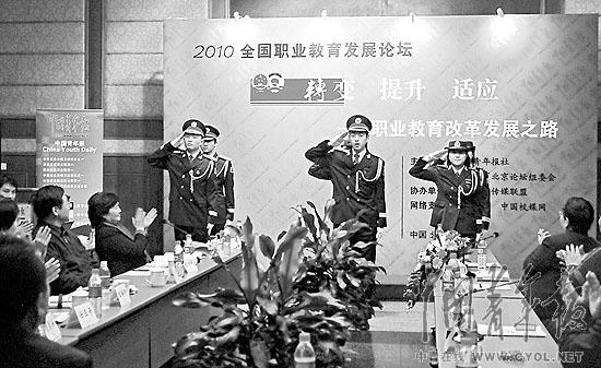3月9日,北京市商业学校国旗班的同学在2010全国职业教育发展论坛上一展风采。当天,论坛由中国青年报社和亚洲教育论坛北京组委会共同主办。 本报记者 赵青摄