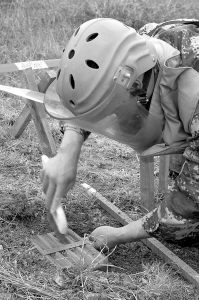 笔者在现场看到,头戴防护面罩、身穿厚厚的防护服的扫雷作业手,时而弯着腰用探雷器来回探测,用喷漆或小红旗做好标示,时而双膝跪在地上用扫雷专用工具进行挖掘,几乎是以厘米的进度向前推进。
