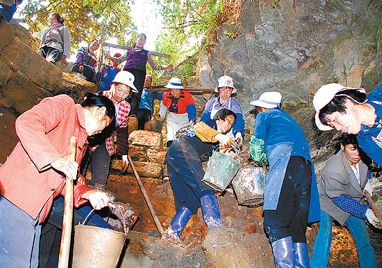 3月18日,云南罗平县皂角洞村的妇女正在清理新找到的水源点。由于云南曲靖市罗平县皂角洞村的一些青壮年劳力外出务工,村内的留守妇女便成为抗旱救灾的主力军。她们自发组织起来,积极开辟新的水源点,开展生产自救。毛虹摄(新华社发)