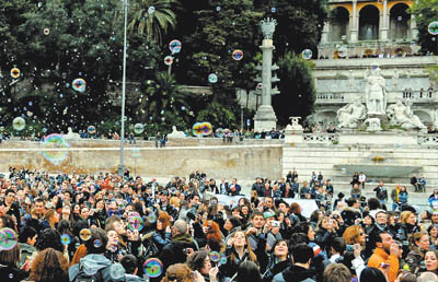 3月21日,在意大利罗马城中的波波洛广场,参加“快闪”族(指一群互不相识的人,通过互联网相约在指定时间和地点集合,然后一起做出一些无意义的动作,例如拍手掌、呼口号等)聚会的人们吹泡泡迎接春天的到来。