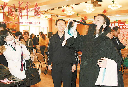 3月22日,一位日本青年在清华大学学生的指导下,穿上戏服,体验京剧艺术。当天,来访的日本青少年友好使者代表团走进清华园,参加中日青年对话交流活动。