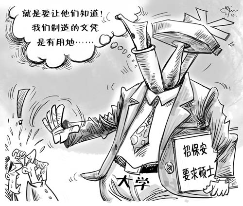 《2010年浙江省部分省属事业单位公开招聘人员公告》3月15日公布后,浙江工业大学之江学院招聘3名保安,一律要求硕士研究生学历。(《武汉晚报》3月21日)