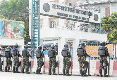 3月23日,泰国首都曼谷,泰国士兵在遭两枚榴弹袭击的公共卫生部前警戒。