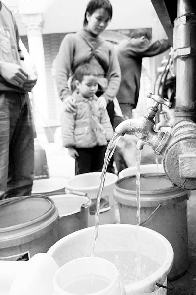 3月22日,广西东兰县东兰镇乐里村的村民在临时供水点取水。