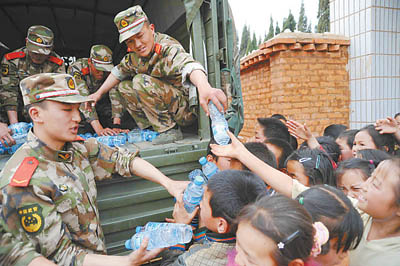 武警云南总队官兵为受灾地区群众送去饮用水。