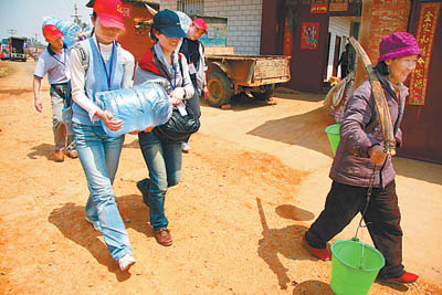 3月20日,昆明环保科普协会和云南省水务局组织30多名志愿者到宜良,为村民送上饮用水,并以每人一天只喝330毫升水的方式体验水资源的宝贵。