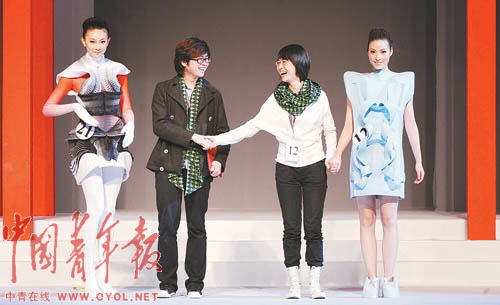 图为北京服装学院24岁的习景凯(左二)和香港理工大学23岁的孙艺菲(右二)分别以作品《镜子图腾》和《艺术之旅》同获银奖。