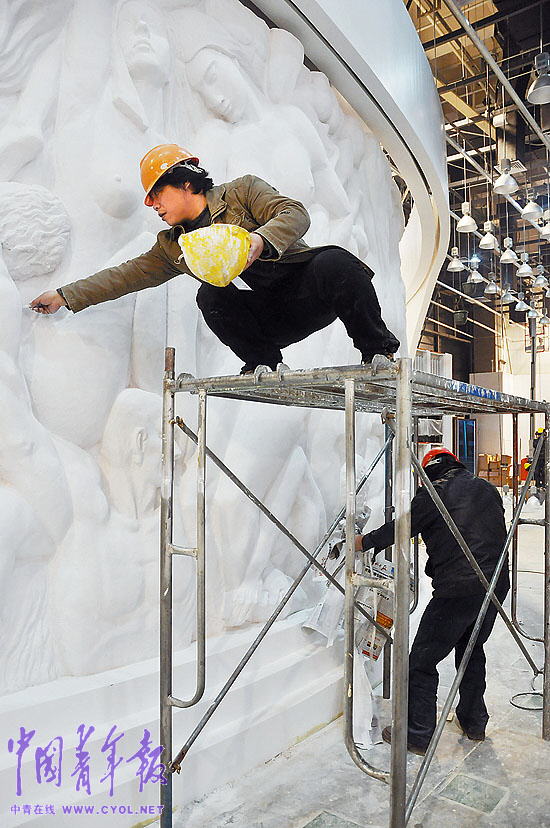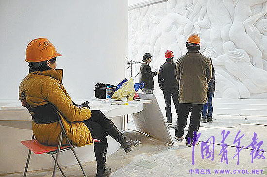 “生命之墙”长11.8米,高3.5米,体量很大,是曹瑞强从事雕塑艺术以来最大的一件作品,中间费了不少周折,终于在3月3日完成了泥塑过程,经过两轮倒模,最后将作品分成16块才运到了世博园,又花了3天时间安装、修补、着色,“生命之墙”才完整地矗立在“生命阳光馆”内。虽然安装、着色的工作都由工人来完成,但曹瑞强没有一丝懈怠,3天时间都守在馆里,只要发现一点小瑕疵马上进行修补,当然他的身边少不了妻子谢璐。虽然馆里同时进行着其他布展的工作,电钻声、焊接声不断,但两人显然不受干扰,几个手势、一个眼神,马上就能明白对方的意思。谢璐的脖子上挂着一个相机,手里还拿着一个摄像机,她要把两人的作品创作过程全部记录下来。