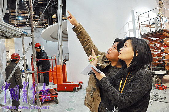 晚上7时,夜色降临,世博园里的阳光谷开始亮灯,位于主题馆内的生命阳光馆里,44岁的曹瑞强摘下头上的安全帽,掏出梳子梳了几下凌乱的头发,对一旁的妻子谢璐打了几个手势,两人开始收拾东西。妻子有点兴奋,脸上带着笑容,因为两人耗时近两个月的作品算是完工了,曹瑞强却显得很平静,等到5月份世博会开幕时,他还会回到这里,给参观者介绍他的作品,只不过是用手语。