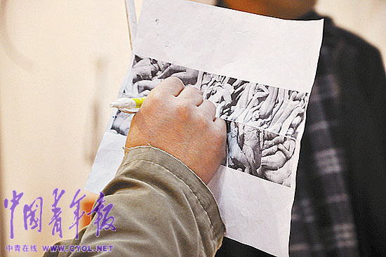 曹瑞强对照着雕塑的图样准备进行细节的调整。