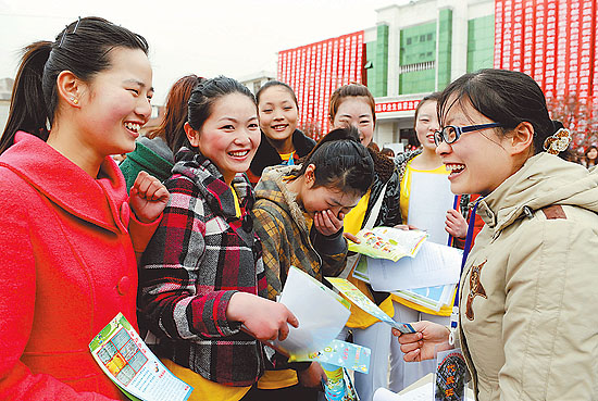 4月1日,安徽省亳州市幼儿师范学校几名毕业生在供需洽谈会上一起交流。当日,在亳州市幼儿师范学校举行的2010届大中专毕业生供需洽谈会上,来自北京、上海、广东、浙江、江苏、河南等省市的268家用人单位为600名幼师毕业生提供就业岗位2460个,平均每位毕业生有4个可以自己选择的就业岗位。手工、美术、舞蹈、乐器……手持简历的幼师毕业生个个都有自己的“拿手绝活”,成为各地用人单位眼中的“香饽饽”。张延林摄(新华社发)