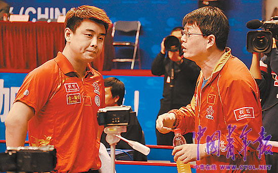 在比赛中,王皓的主管教练吴敬平使用了全部暂停机会,他或循循善诱或言辞激烈地指导着弟子,试图挽回弟子颜面扫地的败局,但效果不佳。