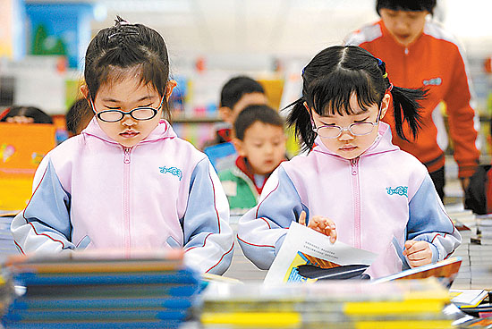 4月2日,两名小朋友在沈阳市北方图书城翻阅喜爱的图书。