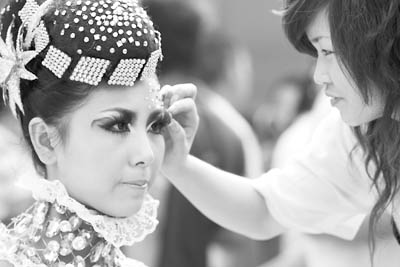 由教育部职业教育与成人教育司和徐州市人民政府共同举办的2009中国淮海职业教育节在江苏徐州市国际展览中心盛大开幕。化妆师现场展示彩妆手法。