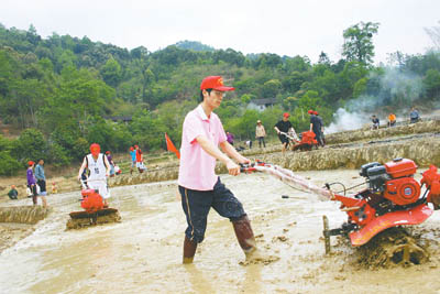 本报讯(特约通讯员吴芳)4月1日,广西河池市东兰县东兰镇那亨村村民韩建设愁眉紧锁的脸绽成了一朵菊花。这天,团东兰县委组织的10多名西部计划志愿者来到他家已经龟裂的水田,带来了抽水机、水管和小铁牛,抽水、犁田、修整田埂,一个下午把他家近1亩的田地抽足了水,犁耙翻整完毕。“还有15天,我靠挑远水精心培育的一畦秧苗就能插播了!”韩建设说。