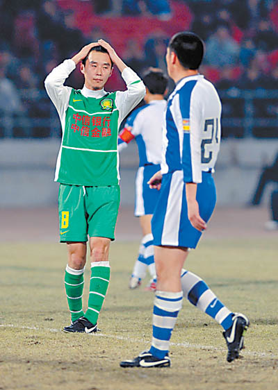 4月4日,北京国安队球员杨昊(左)错失进球良机。