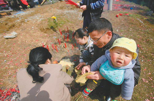 4月4日,四川汶川映秀镇地震遇难者公墓,11个月大的严振鸿被爸爸妈妈带着来到姐姐坟前。震后新生命用稚嫩的声音喊着刚学会的词“姐姐”。