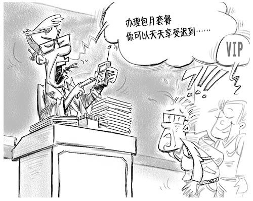 石家庄某中学高一的一些班级,对迟到学生进施行5至10元不等的罚款。有的学生办了200元至300元的包月,就可以天天迟到。(《燕赵晚报》4月7日)