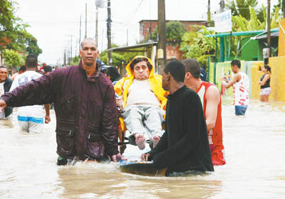 4月6日,在巴西里约热内卢以南70公里处,人们帮助一名坐轮椅的老人转移。