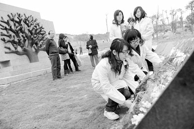4月2日,厦门市恩泽园,几名大学生向遗体与器官捐赠志愿者纪念碑献花。据介绍,该市目前已有160名志愿者办理了遗体捐赠登记手续,113名志愿者办理了器官捐赠登记手续。