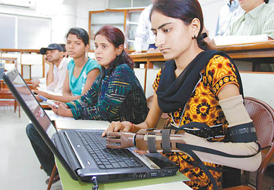 2010年4月3日,印度艾哈迈达巴德,一名女孩展示如何借助假肢使用笔记本电脑。