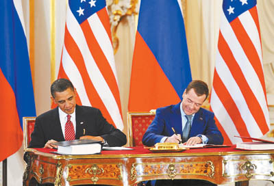 俄罗斯总统梅德韦杰夫和美国总统奥巴马4月8日在捷克首都布拉格正式签署《削减和限制进攻性战略武器新条约》。