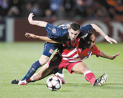 4月8日,里昂队客场以0∶1负于波尔多队,但仍以3∶2的总比分晋级欧冠四强。图为双方球员在争抢。