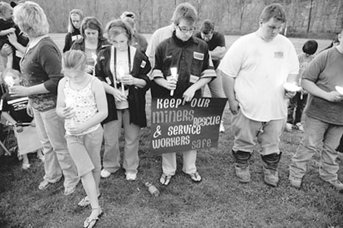 图为4月7日,在美国西弗吉尼亚州的怀茨维尔,人们手捧点燃的蜡烛守夜,悼念芒特考尔煤矿事故中遇难的矿工。