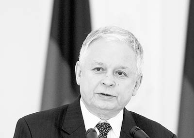 图为2010年4月8日,波兰总统卡钦斯基在立陶宛的维尔纽斯出席记者会。