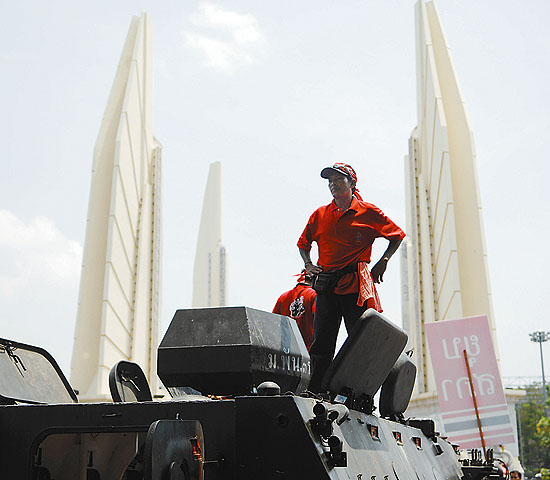 11日,在泰国首都曼谷民主纪念碑附近,“红衫军”成员站在损毁的军车上。新华社记者 史先振摄