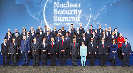 4月13日,国家主席胡锦涛在华盛顿出席核安全峰会。这是会议开始前,与会领导人集体合影。新华社记者 李学仁摄