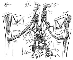 汽油近日涨价,中航油在贵阳的两家加油站的93号汽油,却以每升低于其它加油站0.1元的价格销售。一些贵阳车主据此质疑汽油存在暴利。(金黔在线4月5日)漫画:徐简