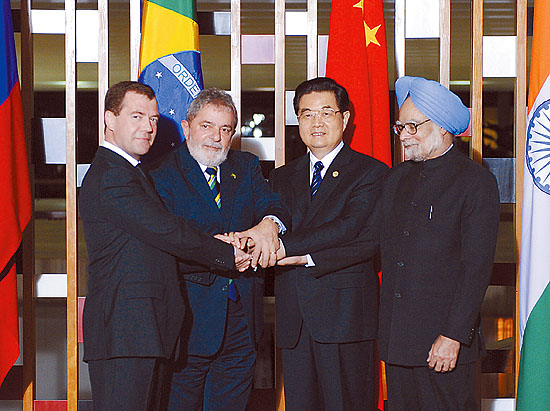 4月15日,“金砖四国”领导人第二次正式会晤在巴西利亚举行。这是胡锦涛主席与巴西总统卢拉、俄罗斯总统梅德韦杰夫、印度总理辛格一起合影。新华社记者 李学仁摄