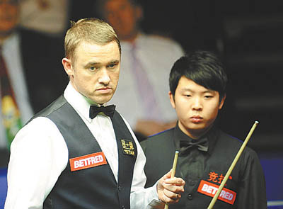 4月18日,中国小将张安达在斯诺克世锦赛上,以9∶10惜败于有“台球皇帝”之称的亨德利(左),未能晋级。