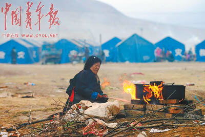 4月20日,玉树结古镇一处受灾群众安置点,一位藏族大妈正在生火做早饭。