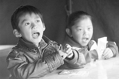 4月20日,在玉树县第二完全小学,两名学生在帐篷小学里读书。当日,来自四川省绵阳市的“完美春天”志愿者队伍在玉树县第二完全小学建立起的一所帐篷学校开课。
