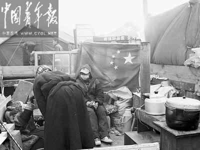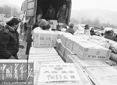 4月20日,玉树结古镇赛马场安置点,藏族同胞正在卸下本报捐赠的藏茶。当天,由本报捐赠的价值30万元的茶叶及茶饮品运抵地震灾区。